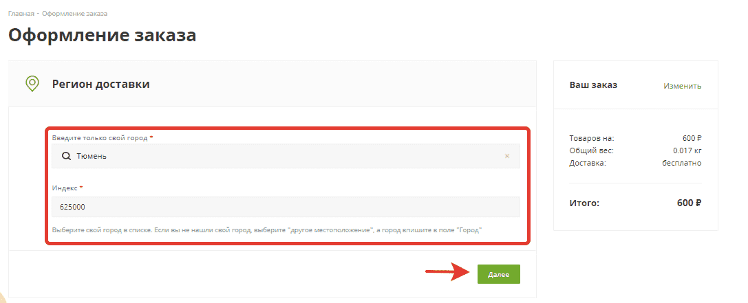Заполните поля в разделе “Регион доставки” и нажмите “Далее”: