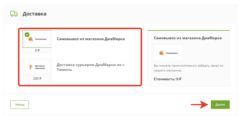 Выберите способ доставки и нажмите “Далее”: