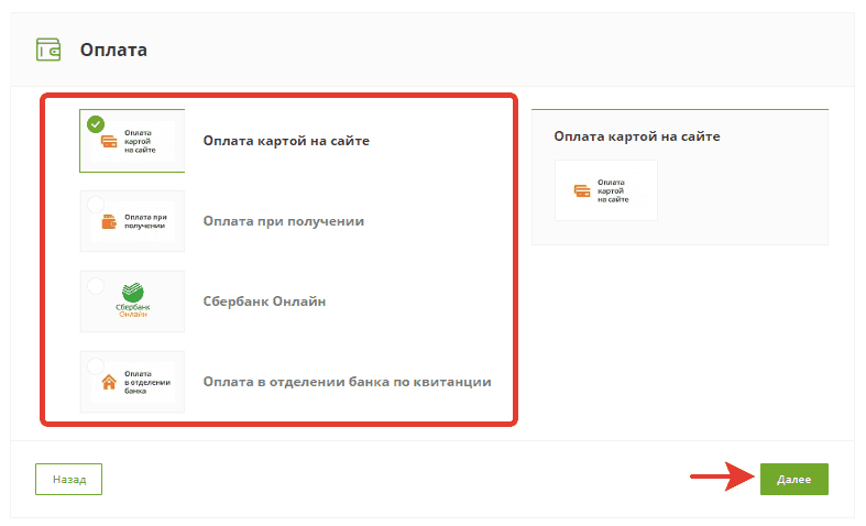 Выберите способ оплаты и нажмите “Далее”: