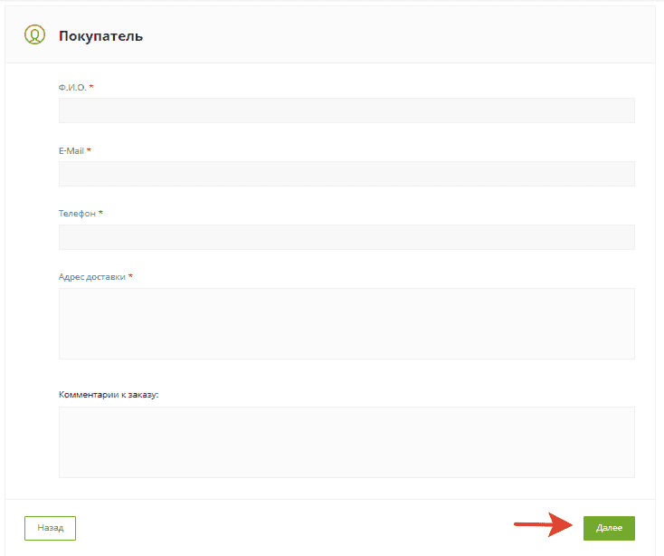 Заполните контактную информацию и оставьте комментарий к заказу, если  это необходимо. После заполнения нажмите “Далее”:
