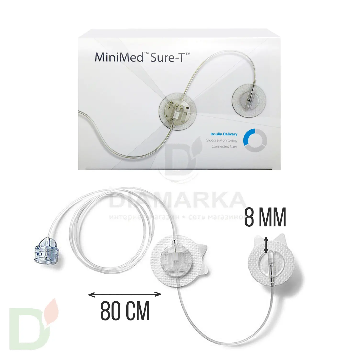 Устройство для инфузии Шуа-Ти 8/80 (ММТ- 876) представляет собой набор из стальной канюли и двух тонких трубочек, которые соединяются с инсулиновой помпой компании Медтроник. Длина иглы в системе ММТ-876 составляет 8 мм, длина трубочки – 80 см.