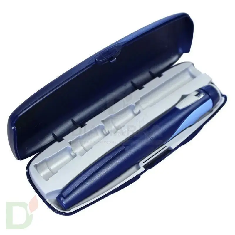В чехле предусмотрено место для хранения запасного картриджа с инсулином и трех инсулиновых игл, что делает его удобным для повседневного использования и переноски.