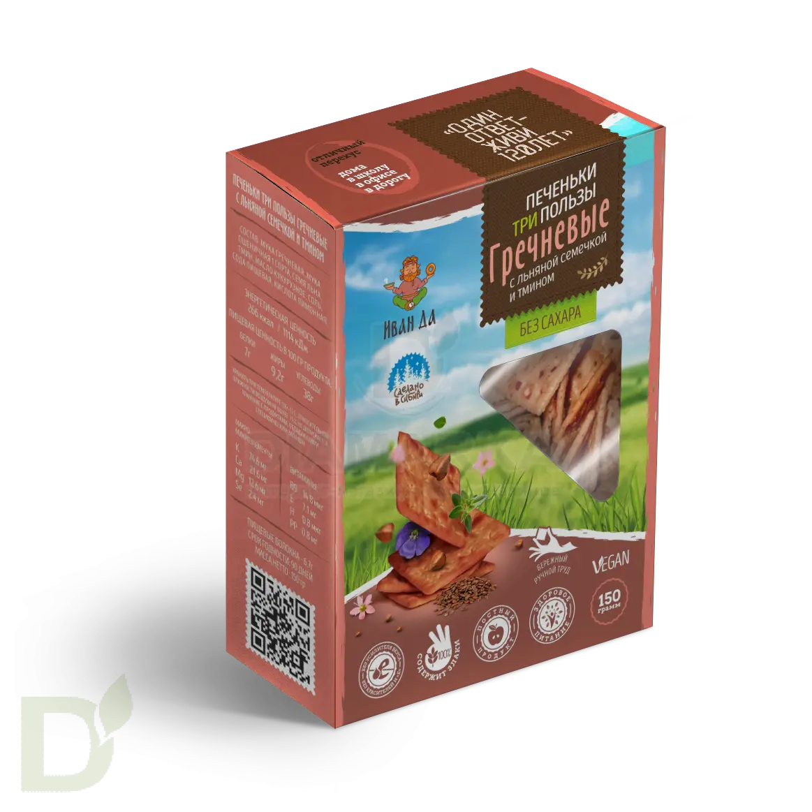<h2>Гречневые крекеры для правильного и здорового питания</h2> Компания Иван-ДА производит оригинальные и уникальные продукты, которые на все 100% соответствуют принципам здорового питания. Сырье для продукции проходит тщательный отбор, а в составе вы не найдете синтетических компонентов: все изготовлено исключительно с любовью и заботой о здоровье потребителя! Натуральность, уникальность и польза - вот главные ценности бренда.<br> <br> <h3>Хрустящее печенье с натуральным составом</h3> Печенья Три Пользы - это бодрая хрустящесть, насыщенный и яркий вкус, питательность, сытость и польза. Ниже мы приводим подробный состав, чтобы вы могли сами убедиться в натуральности этих хрустяшек!<br> <h3>Печенье для правильного перекуса и не только</h3> Продукт послужит отличным перекусом "на скорую руку": пачечка ароматного, пряного печенья всегда должна быть наготове, на случай, если вы захотите подкрепиться.<br> <br> Подходит для веганов, диабетиков, тех кто не употребляет сахар и следит за фигурой и питанием.<br> <br> Срок годности: 90 дней<br> Вес: 150 грамм<br> <h4>Состав гречневого печенья</h4> мука гречневая, мука пшеничная 1 сорта, семя льна, тмин, масло растительное кукурузное, масло растительное подсолнечника, соль поваренная, сода пищевая, кислота лимонная.<br> <h4>Пищевая ценность в 100 гр</h4> белки – 7<br> жиры – 9,2<br> углеводы – 38<br> пищевые волокна - 1,5<br> 266 ккал