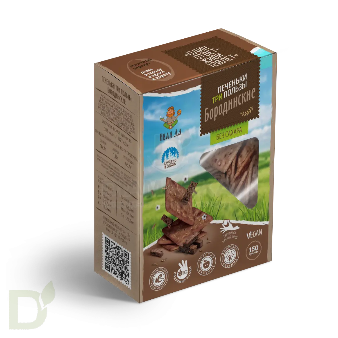<h2>Продукты для правильного и здорового питания от Иван-ДА</h2> Компания Иван-ДА производит оригинальные и уникальные продукты, которые на все 100% соответствуют принципам здорового питания. Сырье для продукции проходит тщательный отбор, а в составе вы не найдете синтетических компонентов: все изготовлено исключительно с любовью и заботой о здоровье потребителя! Натуральность, уникальность и польза - вот главные ценности бренда.<br> <h2>Хрустящее печенье с натуральным составом</h2> Печенья Три Пользы - это бодрая хрустящесть, насыщенный и яркий вкус, питательность, сытость и польза. Ниже мы приводим подробный состав, чтобы вы могли сами убедиться в натуральности этих хрустяшек!<br> <h2>Не забудьте взять с собой</h2> Продукт послужит отличным перекусом "на скорую руку": пачечка ароматного, пряного печенья всегда должна быть наготове, на случай, если вы захотите подкрепиться.<br> <br> Подходит для веганов, диабетиков, тех кто не употребляет сахар и следит за фигурой и питанием.<br> <br> Срок годности: 90 дней<br> Вес: 150 грамм<br> <h2>Состав печенья Бородинского</h2> мука ржаная, ржаной солод, пшеничная закваска, ржаная закваска, мука 1 сорт, ячменный солод, пшеничный солод, масло кукурузное, тмин, кориандр, соль поваренная, сода пищевая.<br> <h2>Пищевая ценность в 100 гр</h2> белки – 16,3 гр.<br> жиры – 1,8 гр.<br> углеводы – 65,4 гр.<br> 313 ккал